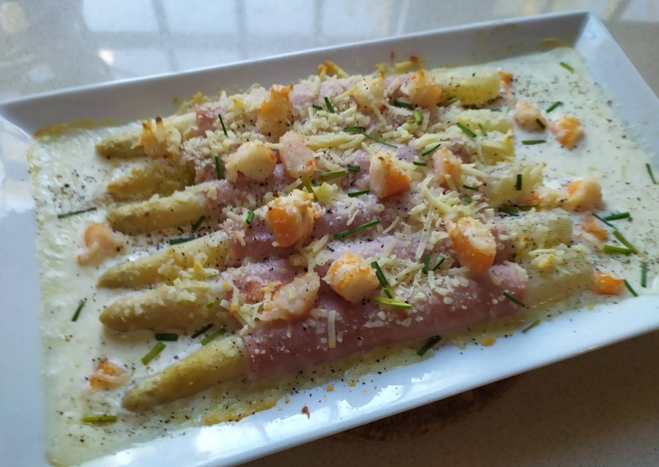 Espárragos gratinados con Jamón York y langostinos